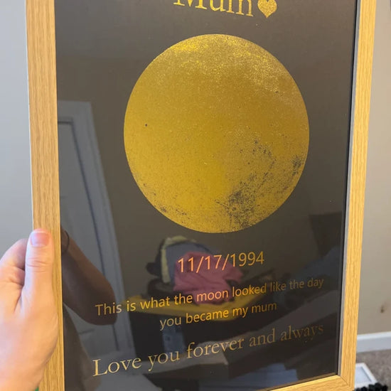 Het gepersonaliseerde kader "Maanfase" is een uniek cadeau dat het magische moment van de maanfase op een specifieke datum vastlegt, of het nu een geboorte, verjaardag of een andere speciale gelegenheid is.