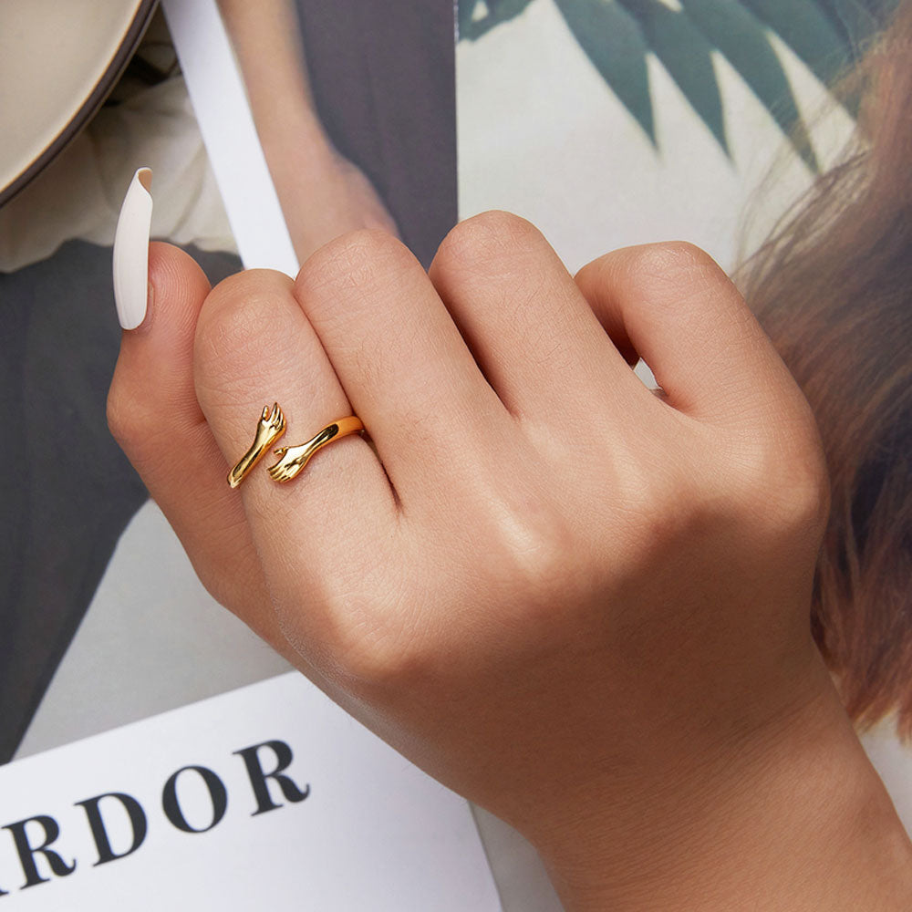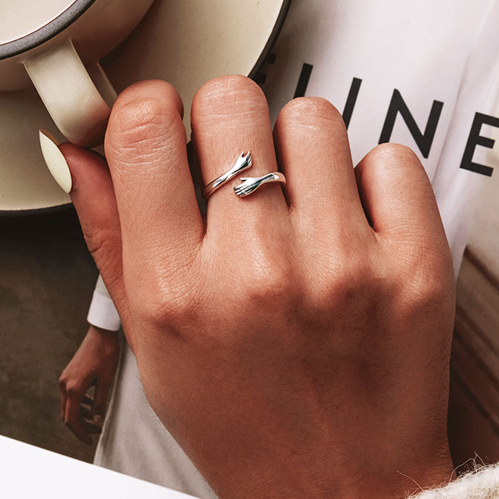 Simte căldura unei îmbrățișări eterne cu acest inel. Această piesă unică înfățișează două mâini care îți prind delicat degetul în imaginea unei îmbrățișări eterne. Mai mult decât un simplu inel, este un simbol al confortului și iubirii pe care îl puteți purta în fiecare zi.